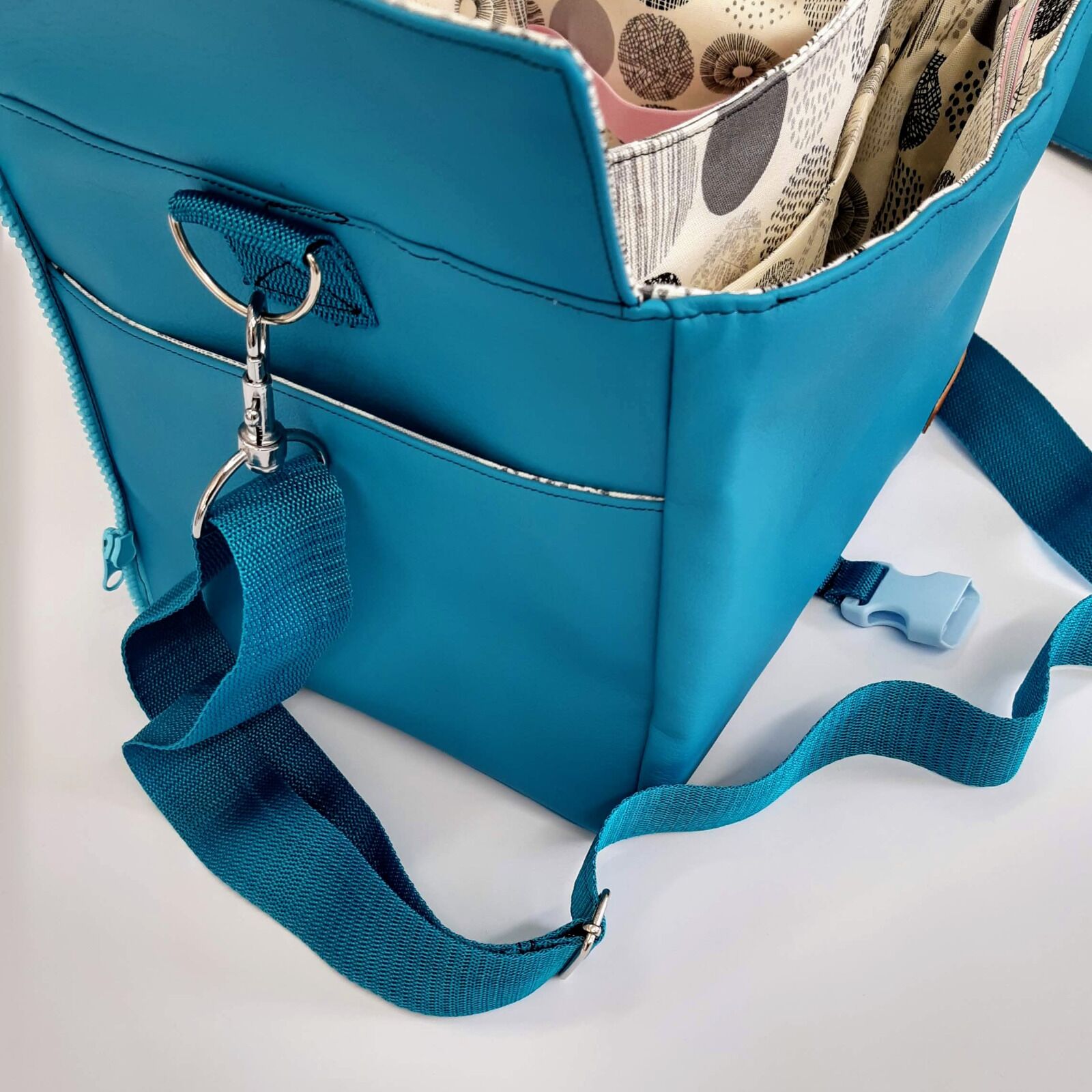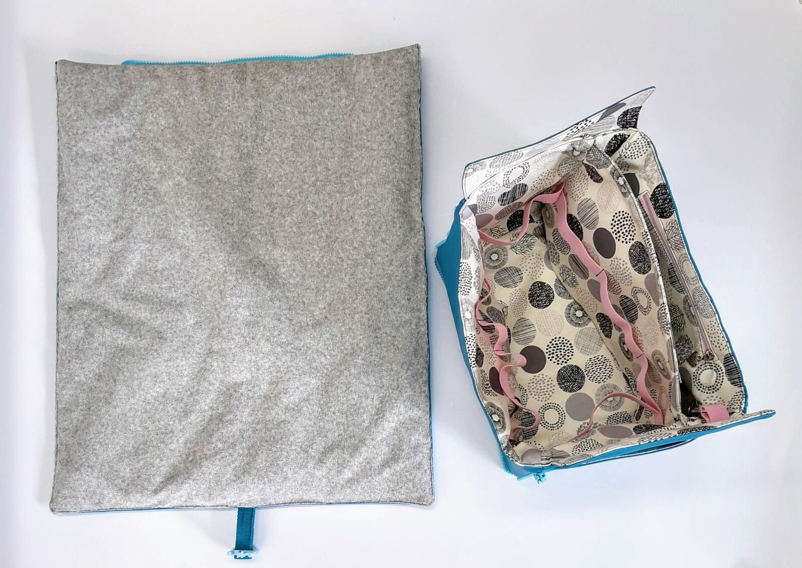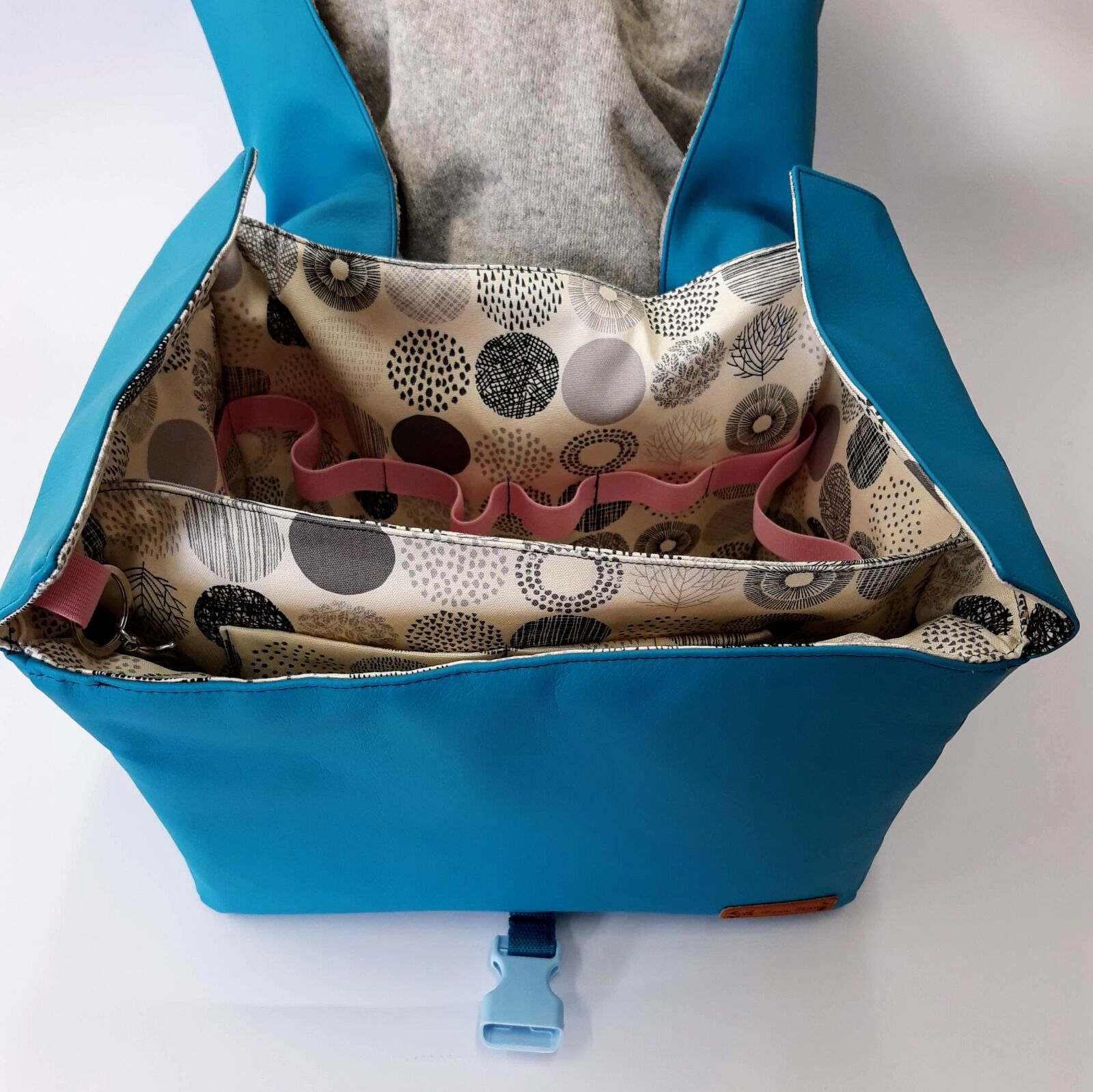 The diaper bag can be made out of all solid fabrics like leather, imitation leather, canvas, felt or coated cotton. For the lining we recommend canvas or cotton.